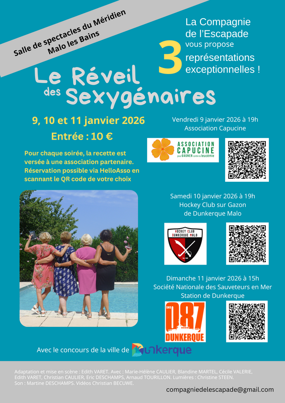 Pièce de théâtre proposée par la Compagnie de l'Escapade. Ses comédiens jouent bénévolement. La recette des trois représentations proposées sera reversée à trois associations partenaires :